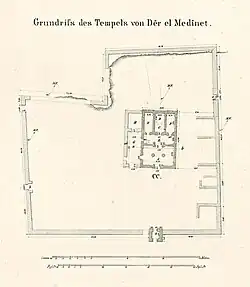 Le temple lui-même est un édifice rectangulaire en grès[4] orienté selon un axe sud-est/nord-ouest[5]. Le bâtiment s'ouvre sur un péristyle formé de colonnes lotiforme et papyriforme. Le péristyle est suivi d'un pronaos contenant plusieurs piliers ornés de la tête de la déesse Hathor[2]. Un escalier dans le pronaos permet d'accéder au toit du temple[5]. Le naos au fond du bâtiment est divisé en trois chapelles où étaient vénérés Hathor, et dans une moindre mesure, Maât, la triade de Thèbes et la triade de Médamoud[2]. Imhotep et Amenhotep fils de Hapou, deux grands savants en leur temps déifiés après leur mort, sont aussi représentés dans le temple[8].