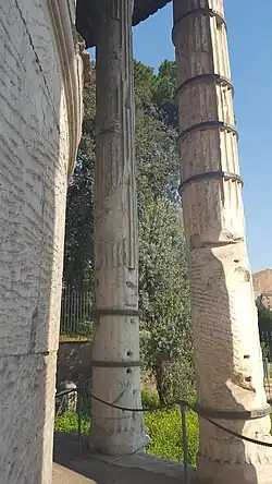 La construction du monument date de la deuxième moitié ou même du dernier tiers du IIe siècle av. J.-C. Une seconde phase de construction, visible à mi-hauteur du mur de la cella et dans la partie nord-ouest de la colonnade, est entreprise dans le second quart du Ier siècle apr. J.-C.. Il peut s'agir d'une simple poursuite programmée du chantier[15], à moins qu'elle ne soit consécutive aux dégâts causés lors de l’importante inondation qui, en l'an 15 sous Tibère[3], renverse le temple de Vesta et d'autres monuments, comme le rapporte Horace[U 4].