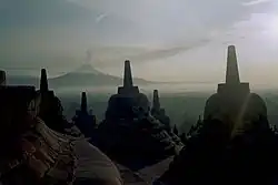 Derrière les stûpas, le volcan Merapi fumant.
