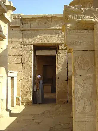 Devant ce pylône se trouve un kiosque à colonnes composites reliées entre elles par des murs d'entrecolonnement. Quatre autres portails précédent ce kiosque. Ainsi la première entrée du temple est la plus récente, datant de l'époque ptolémaïque, et plus on avance vers le sanctuaire plus on remonte dans le temps.
