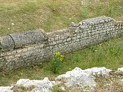 Le péribole du dernier état du temple dessine un carré presque parfait d'une centaine de mètres de côté, certainement bordé intérieurement de portiques à colonnades[12]. En opus vittatum, il est construit sur un remblai de plus de 2 m d'épaisseur qui noie les précédentes maçonneries[18].