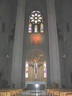 Depuis la crypte on accède à une chapelle consacrée à l'Adoration Perpétuelle, excavée dans la même montagne à la fin des années 1940, formée de trois nefs divisés par des colonnes. L'intérieur est ornementé de marbres et mosaïques sur le pavement et des peintures de Miquel Farré sur les murs, réalisées entre 1947 et 1949[15]. L'église est couronnée par l'énorme statue en bronze du Sacré Cœur faite par Josep Miret en 1950 en remplacement de l'original de Frederic Marès de 1935, détruite au début de la Guerre d'Espagne, en 1936. Le sens ascensionnel depuis la crypte, en passant par le temple jusqu'à la sculpture, reflète l'ascension et la purification de la condition humaine par l'intermédiaire du sacrifice et l'expiation[16].