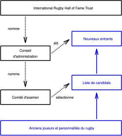 L'International Rugby Hall of Fame Trust est une association à but non lucratif néo-zélandaise. Son conseil d'administration est composé de dix à vingt personnes nommées de manière à représenter les nations majeures de rugby. Ce conseil est chargé d'élire les nouveaux Hall of Famers tous les deux ans[5]. La grande majorité des membres ont été nommés au Temple de la renommée avant leur désignation au conseil d'administration[6].