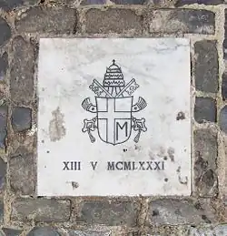 Plaque commémorative de la tentative d'assassinat sur la place Saint-Pierre, portant les armoiries papales de Jean-Paul II et la date en chiffres romains XIII V MCMLXXXI (13 5 1981).