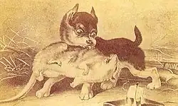 Illustration d'un concours de chiens ratiers, très à la mode au XIXe siècle. Le chien représenté, de petite taille, présente un patron noir et feu.