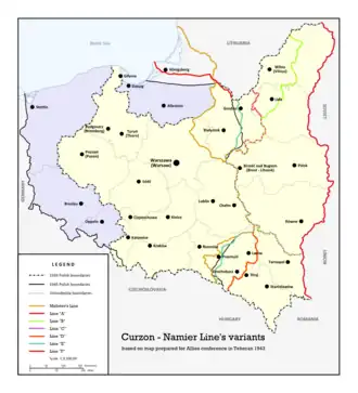 Peu de temps après la ré-invasion de la Pologne en juillet 1944 par l’armée soviétique lancée à la poursuite de l'armée allemande, le premier ministre polonais à Londres s'envola pour Moscou avec Churchill dans une tentative pour empêcher l'annexion soviétique de la Pologne en conformité avec le pacte Molotov-Ribbentrop signé par l'Union soviétique[35]. Il offrit une petite partie de son territoire, mais Staline refusa, lui disant qu'il permettrait au gouvernement en exil de participer au Comité polonais de libération nationale[35]. Un accord entre les Alliés fut atteint à contrecœur lors de la conférence de Yalta où les Soviétiques annexeraient la totalité de la partie de la Pologne orientale que leur avait accordée le pacte Molotov-Ribbentrop, mais accorderait à la Pologne une partie de l'est de l'Allemagne en compensation[35]. Par la suite, la Pologne orientale fut annexée et rattachée à la république socialiste soviétique d'Ukraine et à la république socialiste soviétique de Biélorussie[35].
