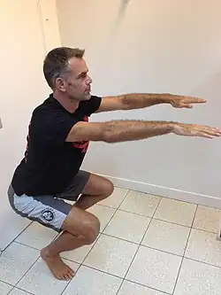 - le sujet doit ensuite se lever et effectuer 30 flexions complètes de jambes en 45 secondes, bras tendus devant lui. À la suite des 45 secondes d'effort, le pouls est pris immédiatement ;