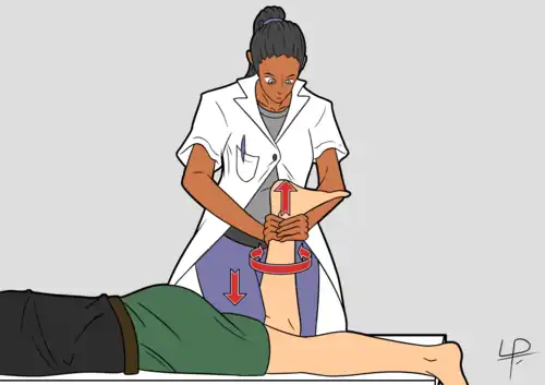 - Manœuvre : une fois la cuisse immobilisée, l'examinateur empoigne la cheville et effectue une traction du tibia par rapport au fémur. Ensuite, il effectue des mouvements de rotation médiale et latérale répétée du tibia.