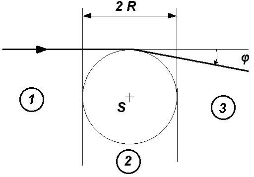 Supposons donc que l'on attribue une masse au photon[n 4], afin que celui-ci soit influençable par la force de gravitation de Newton créée par l'astre. On imagine alors l'expérience de diffusion très simplifiée suivante, décomposable en trois phases successives :