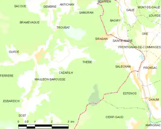 Les communes les plus proches[Note 1] sont[4] : Cazarilh (1,2 km), Troubat (1,4 km), Bramevaque (1,8 km), Siradan (1,8 km), Mauléon-Barousse (2,0 km), Samuran (2,4 km), Sainte-Marie (2,6 km), Gembrie (3,0 km).