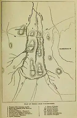 La position centrale de Thèbes, dans une région au relief peu escarpé, en faisait le croisement naturel des routes qui reliaient le golfe de Corinthe et l’Attique à la Grèce-Centrale et à l’Eubée, d’où son importance économique et militaire.