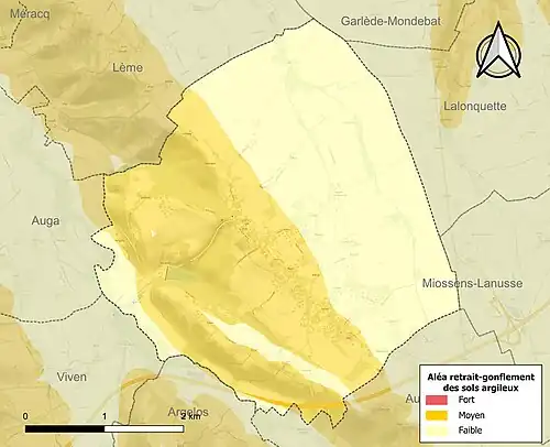 Le retrait-gonflement des sols argileux est susceptible d'engendrer des dommages importants aux bâtiments en cas d’alternance de périodes de sécheresse et de pluie[27]. 46,9 % de la superficie communale est en aléa moyen ou fort (59 % au niveau départemental et 48,5 % au niveau national)[Carte 3]. Depuis le , en application de la loi ELAN, différentes contraintes s'imposent aux vendeurs, maîtres d'ouvrages ou constructeurs de biens situés dans une zone classée en aléa moyen ou fort[Note 4],[28].