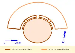 Sa cavea, qui ne forme pas tout à fait un demi-cercle, ce qui le rapproche de l'édifice du site gallo-romain de Montbouy, possède un diamètre de 94 m et sa capacité est estimée à 5 000 personnes. Certains gradins, près de l'arène, sont aménagés pour les notables, le reste de la cavea étant composé d'une pente de terre retenue par un contrefort à l'arrière. Les spectateurs prennent peut-être alors place sur des gradins en bois, dont les clous de fixation sont retrouvés lors des fouilles [11].