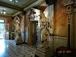 Dans un deuxième vestibule sont placées les statues de la Comédie et de la Tragédie, du sculpteur genevois Pietro Capurro.