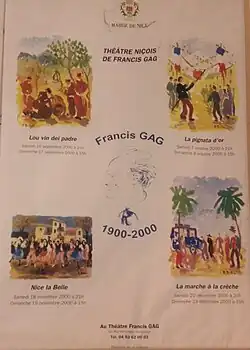 Le Théâtre niçois de Francis Gag est considéré aujourd'hui comme la plus importante troupe de théâtre de la ville de Nice[7]