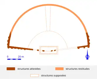 Le mur périmétral de la cavea est conservé de chaque côté sur un tronçon d'environ 20 m de long. Il est renforcé par des contrforts plaqués, trois sont conservés à l'ouest et trois à l'est[19].