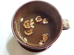 생강차 (saeng-gang cha), chinois 生薑茶 (Shēng jiāng chá). La tisane de gingembre (Zingiber officinale) est une infusion traditionnellement utilisée comme phytothérapie en Asie, sa saveur «est brûlante, poivrée et aromatique, elle réchauffe et rend service à toutes les occasions et saisons de l'année. Elle est stomachique, excitante, anti-infectieuses et sudorifique»[133]. On infuse du gingembre frais ou sec[134]15 min dans l'eau très chaude en la parfumant au zeste d'orange[135]. Cette boisson fait l'objet de publications académiques nombreuses dont son utilité contre le diabète de type 2 (2021)[136], la production de boisson aromatisée à la menthe[137], au thé vert[138].