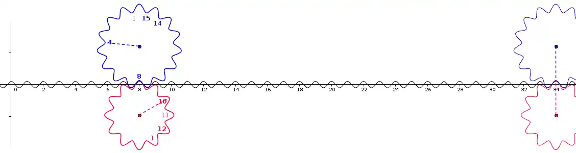 On peut comprendre simplement pourquoi le calcul sur des roues dentées fait intervenir de l'arithmétique modulaire, en remarquant que l'ensemble des dents d'une roue en comptant n peut être paramétré par l'ensemble des racines n-ièmes de l'unité, qui a une structure de groupe naturellement isomorphe à celle de ℤ/n.