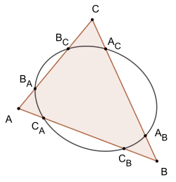 En confondant les deux points, on obtient que les pieds de trois céviennes concourantes sont les points de contact d'une conique inscrite.