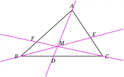On appellera dans la suite cévienne d'un triangle une droite passant par un sommet et rencontrant le segment opposé[4]. Ici, les points D, E et F sont bien sur les côtés.