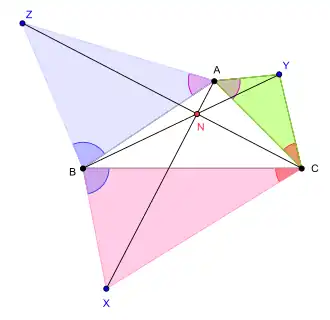 En géométrie, le théorème de Jacobi, ou théorème de Fermat-Toricelli généralisé ou théorème isogonal désigne un résultat de géométrie du triangle[1]. Un point de Jacobi est un point du plan euclidien déterminé par un triangle ABC et un triplet d'angles α, β et γ. Cette information est suffisante pour déterminer trois points X, Y et Z tels que , et . Puis, par un théorème de Karl Friedrich Andreas Jacobi (de), les droites (AX), (BY) et (CZ) sont concourantes[2],[3],[4] en un point N qu'on appelle point de Jacobi[4].