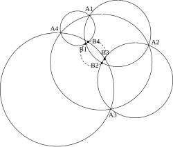 Théorème des quatre cercles — Soient (C1), (C2), (C3) et (C4) quatre cercles. On note respectivement A1 et B1 les intersections de (C1) et (C2), A2 et B2 les points d'intersection de (C2) et (C3), A3 et B3 les intersections de (C3) et (C4) et A4 et B4 les intersections de (C1) et (C4), les points A1, A2, A3, A4 sont alignés ou cocycliques si et seulement s'il en est de même des points B1, B2, B3, B4.