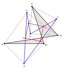 Théorème de Petr-Douglas-Neumann appliqué à un quadrilatère croisé A0 = ABCD. A1 = EFGH est construit en utilisant pour angle au sommet π et A2 = PQRS avec un angle au sommet de π/2. |