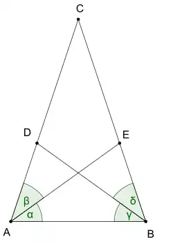 Théorème de Steiner-Lehmus — Soit un triangle ABC. Soient D et E les pieds des bissectrices issues de B et A. On a alors AE = BD si et seulement si ABC est isocèle.