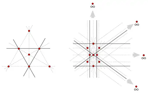 • Le premier, trouvé par Kelly et Moser[8], est composé par les sommets, les milieux d'arêtes, et le centre d'un triangle équilateral ; ces sept points déterminent seulement trois droites ordinaires. La configuration dans laquelle ces trois droites ordinaires se confondent en une seule droite ne peut être réalisée dans le plan euclidien, mais forme un plan projectif fini connu sous le nom de plan de Fano.