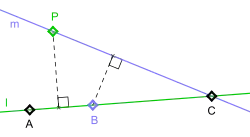 Supposons donc que notre ensemble de points n'est pas aligné, et soit (P,l) un point et une droite de connexion de distance minimale strictement positive parmi tous les points et les droites de connexion. Par hypothèse, l contient alors trois points, notés A, B et C. On considère la perpendiculaire à l passant par P. Il doit y avoir au moins deux points se trouvant d'un côté de la perpendiculaire. Considérons que C est le point le plus éloigné et B le point le moins éloigné de la perpendiculaire. Considérons alors la droite de connexion m passant par C et P. m est alors une droite de connexion qui ne contient pas B et la distance séparant B de m est strictement inférieure à la distance séparant P de l. En effet, si l'on considère les projections, le triangle rectangle hypoténuse BC est semblable à celui d'hypoténuse PC, et strictement inclus dans celui-ci.