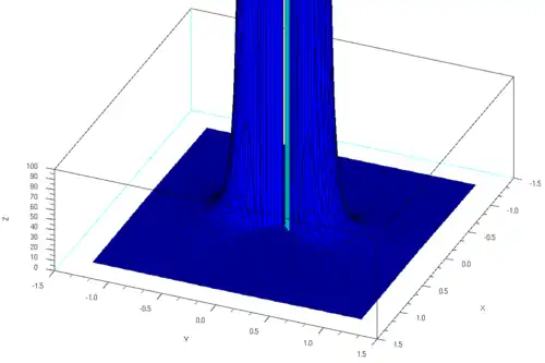 - La fonction définie sur ℂ* possède une singularité qui n'est pas essentielle en (c'est en fait un pôle d'ordre 1). On peut remarquer que quand et la fonction ne vérifie donc pas le théorème de Weierstrass-Casorati.