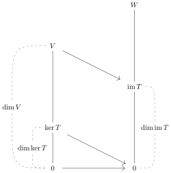 Ce théorème résulte immédiatement du fait que pour tout sous-espace vectoriel V de E, on a[1] dim E = dim E/V + dim V et du théorème de factorisation d'après lequel E/ker(f) est isomorphe à im(f).