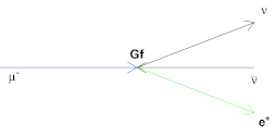 L'interaction de Fermi montrant le courant vecteur à quatre fermions, couplé à la constante de couplage de Fermi GF. La théorie de Fermi fut le premier effort théorique dans la description des taux de désintégrations nucléaires dans la désintégration bêta.