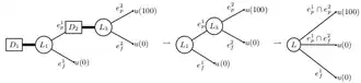 Cette propriété de mixage peut être vue comme une composition de loterie[30]. La loterie correspond à la loterie à deux étapes qui, dans un premier temps, offre les loteries et avec les probabilités et respectivement et, à la seconde étape, offre la conséquence . Cet axiome considère comme équivalent la loterie composée (à plusieurs étapes) et sa forme réduite (à une étape).