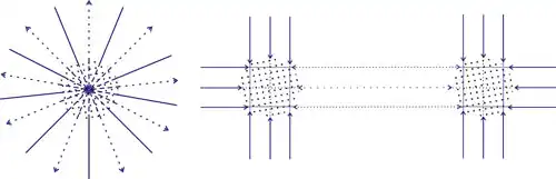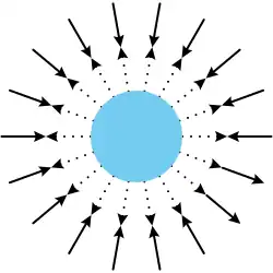 Étant donné que l'on suppose que certaines si ce n'est toutes les particules gravifiques convergeant vers un objet sont soit absorbées soit ralenties par l'objet, l'intensité du flux de particules gravitiques émanant de la direction d'un objet massif est moindre que celle du flux convergeant vers l'objet. On peut imaginer ce déséquilibre de flux de moment, et par conséquent de la force exercée par quelque autre corps dans le voisinage, comme étant distribué sur une surface sphérique centrée sur l'objet (illustration P4). Le déséquilibre de flux de moment sur une surface entièrement sphérique entourant l'objet est indépendante de la sphère encerclante, alors que la surface de la sphère augmente comme le carré du rayon. Par conséquent, le déséquilibre de moment par unité de surface diminue comme l'inverse du carré de la distance.