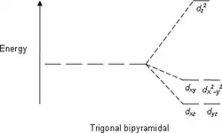Le diagramme d'énergie des niveaux d de l'ion métallique (et donc du complexe puisque dans cette théorie seuls ces niveaux sont considérés) est donc réduit au niveau triplement dégénéré t2g (niveau inférieur) et au niveau doublement dégénéré eg (niveau supérieur).