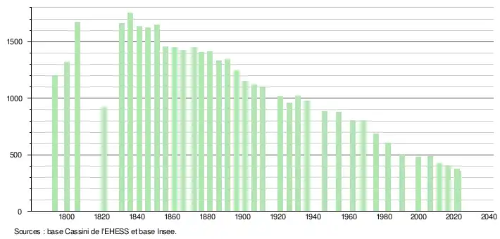 L'évolution du nombre d'habitants est connue à travers les recensements de la population effectués dans la commune depuis 1793. Pour les communes de moins de 10 000 habitants, une enquête de recensement portant sur toute la population est réalisée tous les cinq ans, les populations de référence des années intermédiaires étant quant à elles estimées par interpolation ou extrapolation[16]. Pour la commune, le premier recensement exhaustif entrant dans le cadre du nouveau dispositif a été réalisé en 2006[17].
