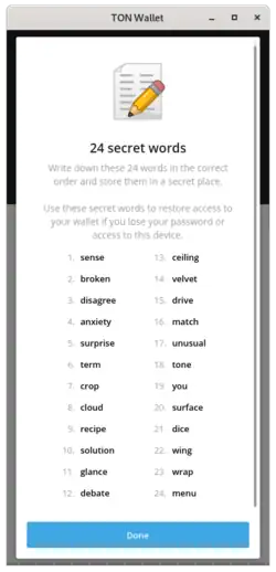 Pour accéder aux portefeuilles, on utilise 24 mots secrets, sur la base desquels on calcule la clé privée de 256 bits du portefeuille.