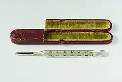 Le thermomètre à mercure a été inventé par Gabriel Fahrenheit en 1724[1]. Son fonctionnement repose sur du mercure contenu dans un tube de verre. Le volume du mercure, donc la longueur de la colonne dans le tube, est fonction de sa température. On peut lire cette dernière grâce à des graduations inscrites le long du tube. Pour augmenter la sensibilité du thermomètre, une ampoule plus large que le tube est formée à l'une de ses extrémités et remplie de mercure ; les petites variations de volume du mercure se traduisent alors par de grands déplacements de l'extrémité de la colonne. L'autre extrémité du tube est remplie d'azote, à une pression plus faible que la pression atmosphérique.