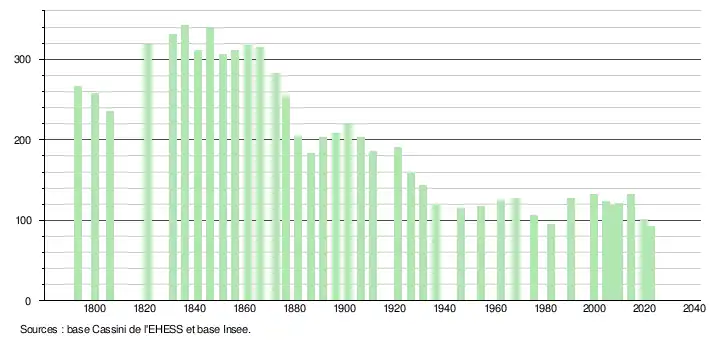 L'évolution du nombre d'habitants est connue à travers les recensements de la population effectués dans la commune depuis 1793. Pour les communes de moins de 10 000 habitants, une enquête de recensement portant sur toute la population est réalisée tous les cinq ans, les populations de référence des années intermédiaires étant quant à elles estimées par interpolation ou extrapolation[26]. Pour la commune, le premier recensement exhaustif entrant dans le cadre du nouveau dispositif a été réalisé en 2004[27].