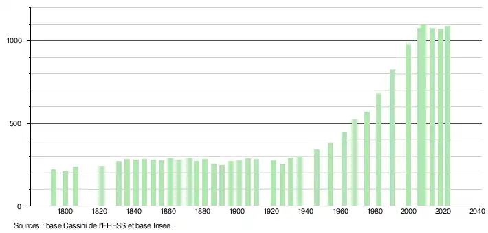 L'évolution du nombre d'habitants est connue à travers les recensements de la population effectués dans la commune depuis 1793. Pour les communes de moins de 10 000 habitants, une enquête de recensement portant sur toute la population est réalisée tous les cinq ans, les populations de référence des années intermédiaires étant quant à elles estimées par interpolation ou extrapolation[34]. Pour la commune, le premier recensement exhaustif entrant dans le cadre du nouveau dispositif a été réalisé en 2008[35].