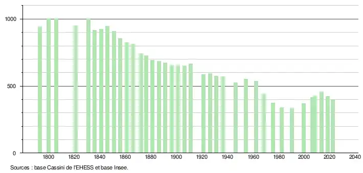 L'évolution du nombre d'habitants est connue à travers les recensements de la population effectués dans la commune depuis 1793. Pour les communes de moins de 10 000 habitants, une enquête de recensement portant sur toute la population est réalisée tous les cinq ans, les populations de référence des années intermédiaires étant quant à elles estimées par interpolation ou extrapolation[14]. Pour la commune, le premier recensement exhaustif entrant dans le cadre du nouveau dispositif a été réalisé en 2008[15].