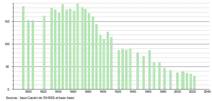 L'évolution du nombre d'habitants est connue à travers les recensements de la population effectués dans la commune depuis 1793. Pour les communes de moins de 10 000 habitants, une enquête de recensement portant sur toute la population est réalisée tous les cinq ans, les populations de référence des années intermédiaires étant quant à elles estimées par interpolation ou extrapolation[14]. Pour la commune, le premier recensement exhaustif entrant dans le cadre du nouveau dispositif a été réalisé en 2007[15].