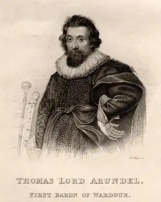 Thomas Arundell, 1er baron Arundell de Wardour (né vers 1560 – 7 novembre 1639), fils aîné de Matthew Arundell de Wardour Castle, dans le Wiltshire (vers 1532/1534 – 24 décembre 1598), s'illustre dans les campagnes militaires contre les Turcs au service de l'empereur Rodolphe II, et est élevé pour cela au rang de comte germanique ; mais cet attachement à un prince catholique déplait à la reine Elisabeth, qui refuse de reconnaître ce titre, et même le fait emprisonner à la prison de la Fleet. À l'avènement de Jacques Ier, en 1605, Arundell est créé 1er baron Arundell de Wardour, mais dans l'année, il est suspecté de complicité dans la conspiration des Poudres.