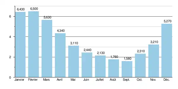 D'autre part, les crues peuvent être assez importantes. Les QIX 2 et QIX 5 valent respectivement 31 et 40 m3/s. Le QIX 10 est de 46 m3/s, et le QIX 20 de 52 m3/s. Quant au QIX 50, il se monte à 78 m3/s. Ceci implique que tous les deux ans, il y ait en moyenne une crue de l'ordre de 31 m3/s, et tous les dix ans, une crue de 46 m3/s[2].