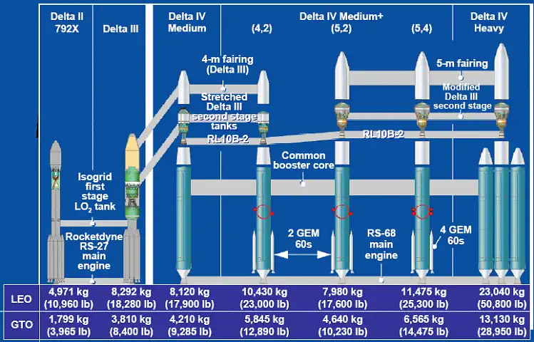 Le lanceur est décliné en deux sous-familles : les Delta-IV Medium et le lanceur lourd Delta IV Heavy.