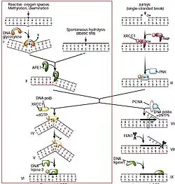 Premièrement, lorsqu’il y a une base nucléique endommagée dans un double brin d’ADN, la Thymine ADN glycosylase la reconnaît et signale l’emplacement de la mutation. La TDG hydrolyse le lien N-glycosidique par lequel la base est attachée au squelette de sucre et la mutation est enlevée, le site AP est créé. Lorsque la TDG dégage la base endommagée, une forte affinité s’installe entre l’enzyme et la guanine restante en face du site AP. L’endonucléase APE-1, en s’approchant de la TDG, permettra de diminuer cette affinité afin de déloger la TDG du site AP. L’APE-1 pourra ensuite effectuer le clivage du nucléotide abasique. La Pol β viendra ensuite polymériser le nouveau nucléotide et la ligase 3 terminera la réparation.