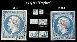 - ↑ Les types I et II des timbres de la série "Empire" ont été décrits par Paul Dillemann, membre (décédé) de l'Académie de Philatélie