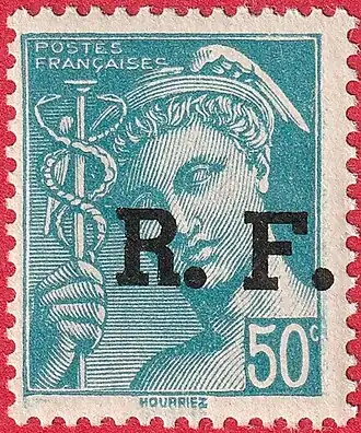Sur les timbres au type Mercure, ces surcharges éphémères ne doivent pas être confondues avec celle réalisée à plus grande échelle par l'atelier général du timbre à Paris en et qui consiste en l'apposition des lettres « RF » dans l'angle supérieur gauche du timbre[4].