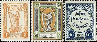 Entre 1907 et 1916, le Sinn Féin, principal mouvement nationaliste de l'époque, émit des timbres de propagande à la gloire de l'indépendance de l'Irlande. Leur usage comme timbres postaux était interdit par les services de contrôle de la poste[6]. L'un d'entre eux représentait une croix celtique similaire à celle plus tard adoptée pour deux timbres courants officiels en 1923 ; un autre représentait une femme devant une harpe celtique. En 1912 les mots Imperial Union (Union Impériale) apparurent sur une série de timbres, l'un d'entre eux reprenant le modèle de la femme et de la harpe, mais en plus grand. On considère que ces timbres, qui expriment des sentiments unionistes, furent imprimés à Manchester comme riposte aux timbres du Sinn Féin. Après le vote du Home Rule act (1914) donnant un premier statut d'autonomie à l'Irlande, une organisation républicaine irlandaise émit des timbres en 1916 avec les portraits de trois héros nationalistes[7] connus sous le nom de Martyrs de Manchester, dessinés sur fond de drapeau tricolore irlandais avec les mots « God save Ireland » (Dieu sauve l'Irlande). Les contrefaçons de ces timbres sont courantes[6]. À la suite des Pâques sanglantes de 1916, des sympathisants américains imprimèrent huit timbres ERIE PUIST figurant sept leaders républicains et un motif « harpe et trèfle ». ERIE est sans doute une faute dans la manière d'épeler ÉIRE, peut-être due à la hâte de leur production[6].